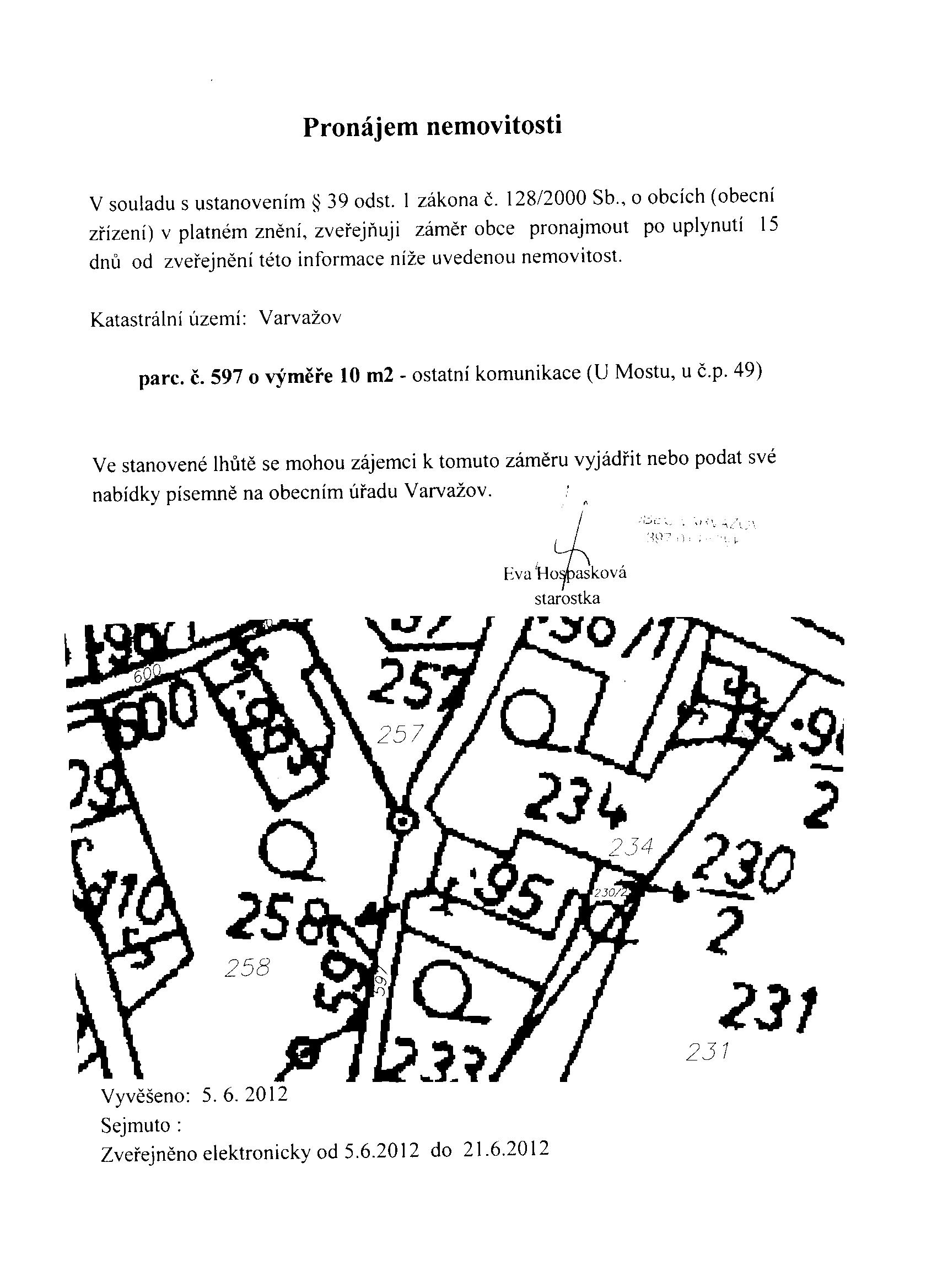 Pronájem p.č. 597 v k.ú. Varvažov